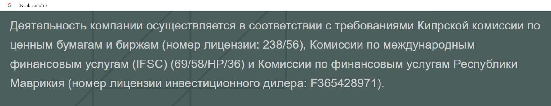 На официальном интернет-сервисе комиссии по финансовым услугам республики Маврикий fscmauritius org нет никакой информации о регистрационном номере шараги ИДС Лаб.