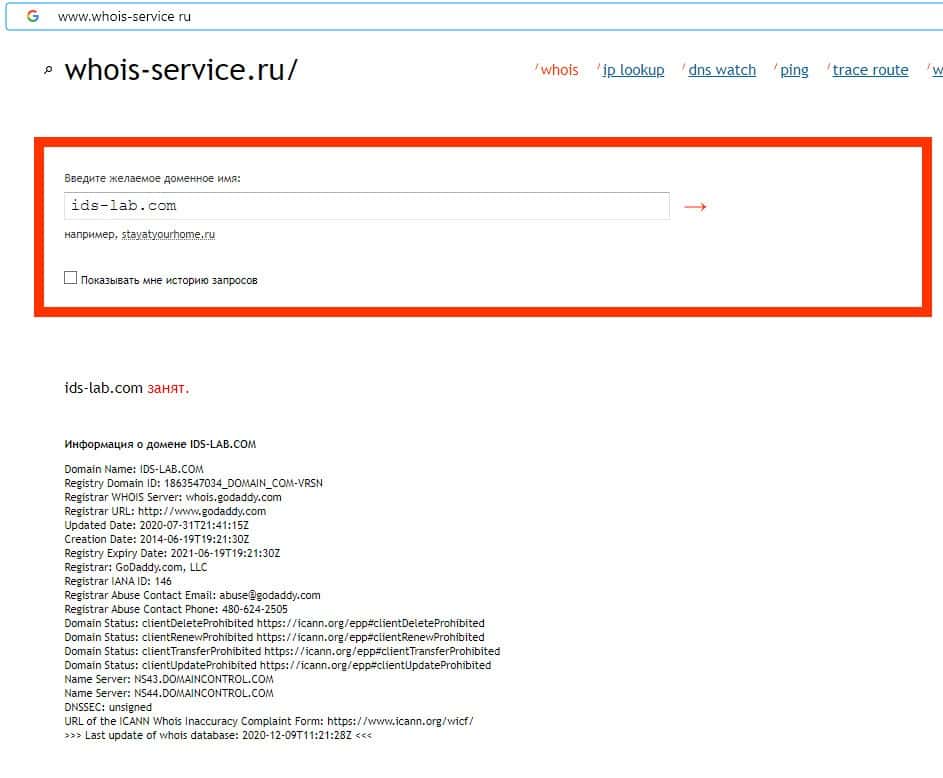 Данные о владельце домена IDS Lab отсутствуют