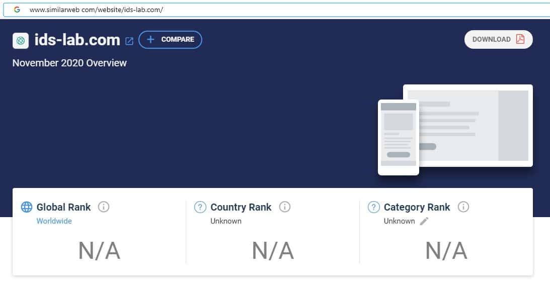 При проверке источников бренда по странам компании IDS Lab на сайте similarweb com, информация отсутствует, что является признаком фейкового лохотрона.