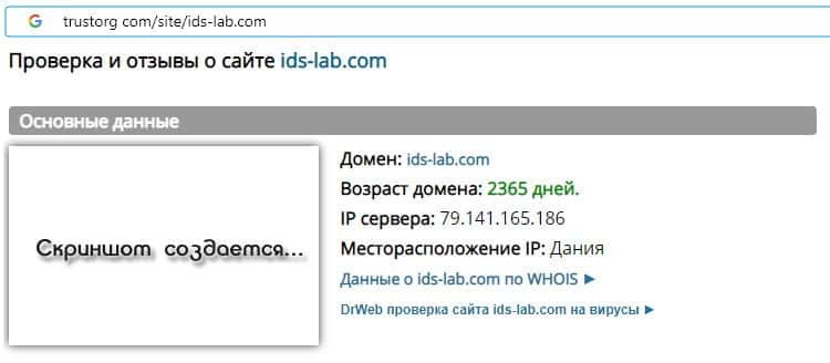 Проверка онлайн-ресурса шулеров ИДС Лаб на trustorg com показала, что возраст домена к моменту написания статьи составляет 2365 дней, вероятнее всего домен купленный.