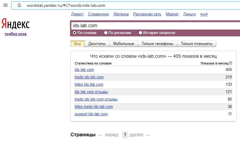 Количество брендовых запросов названия компании на русском языке "ИДС Лаб" на wordstat yandex ru составило всего 3 показа за месяц.