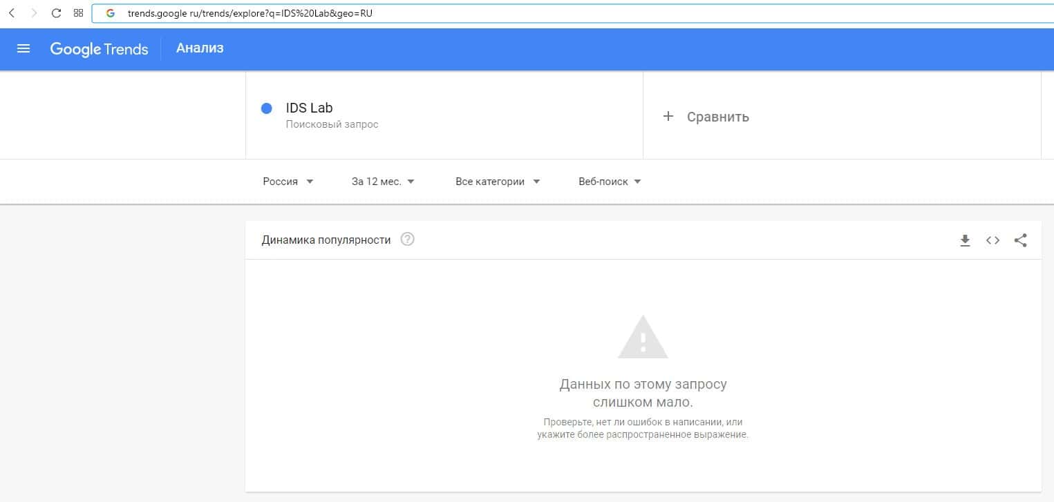 По количеству запросов по бренду названия компании на русском языке "ИДС Лаб" на Гугл Трендс нет никакой информации.