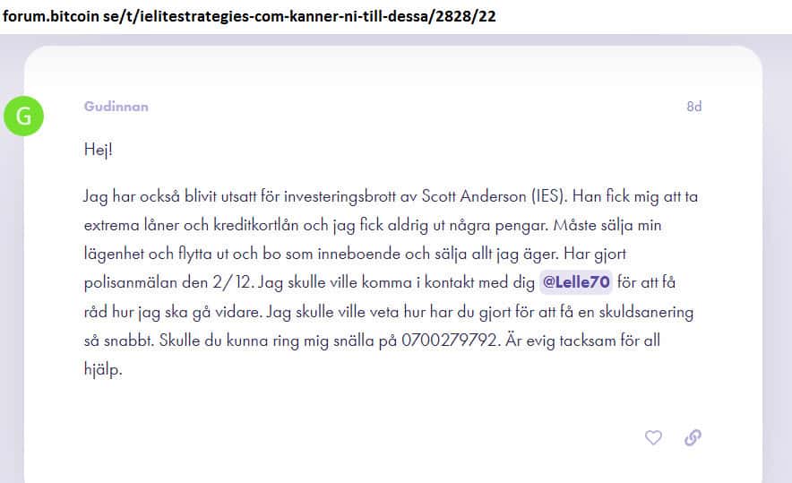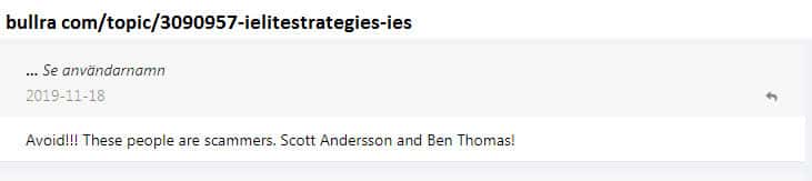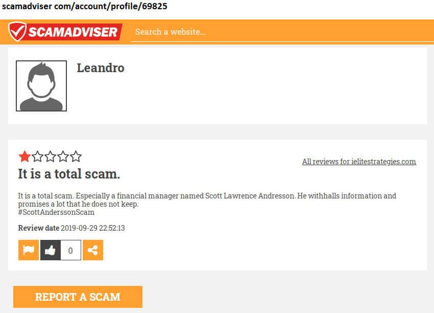 После обзора отзывов в сети о лохо-конторе IES - ielitestrategies com можно сказать, что основная часть обманутых вкладчиков из Швеции, Великобритании, Германии и т.д. В своих комментариях обманутые трейдеры неоднократно обвиняют в мошенничестве финансового менеджера Скотта Андерссона.