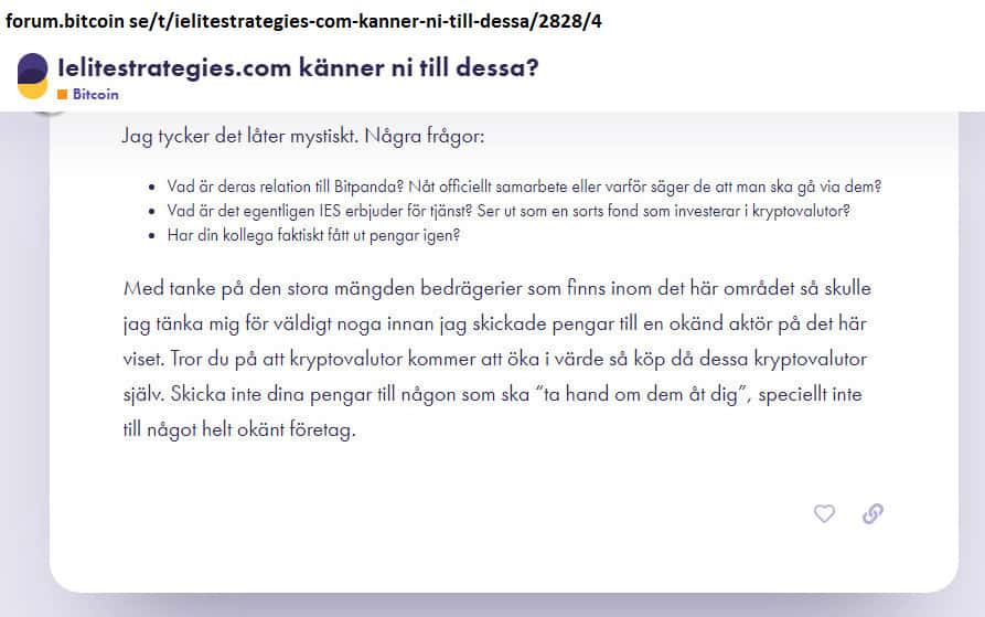 Лоховоды из IES - ielitestrategies com пытаются запудрить мозги своих инвесторов. Для осуществления торговых сделок они прибегают к услугам якобы своих партнеров. Например, для покупки биткоина менеджеры ИЕС убеждают пользователей переводить свои денежные средства не на прямую, а через посредника Bitpanda.