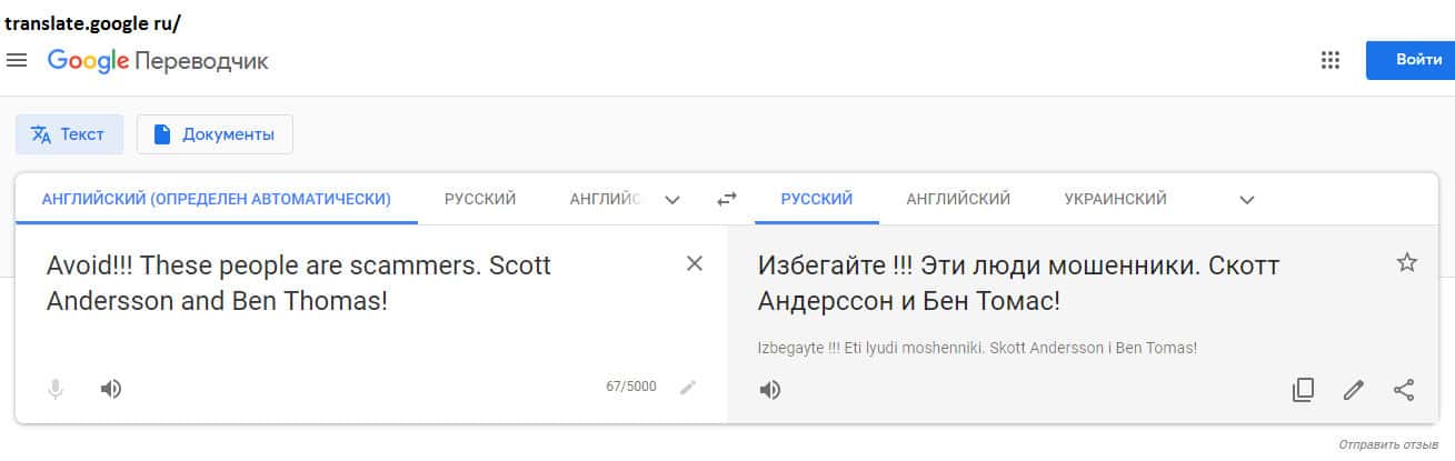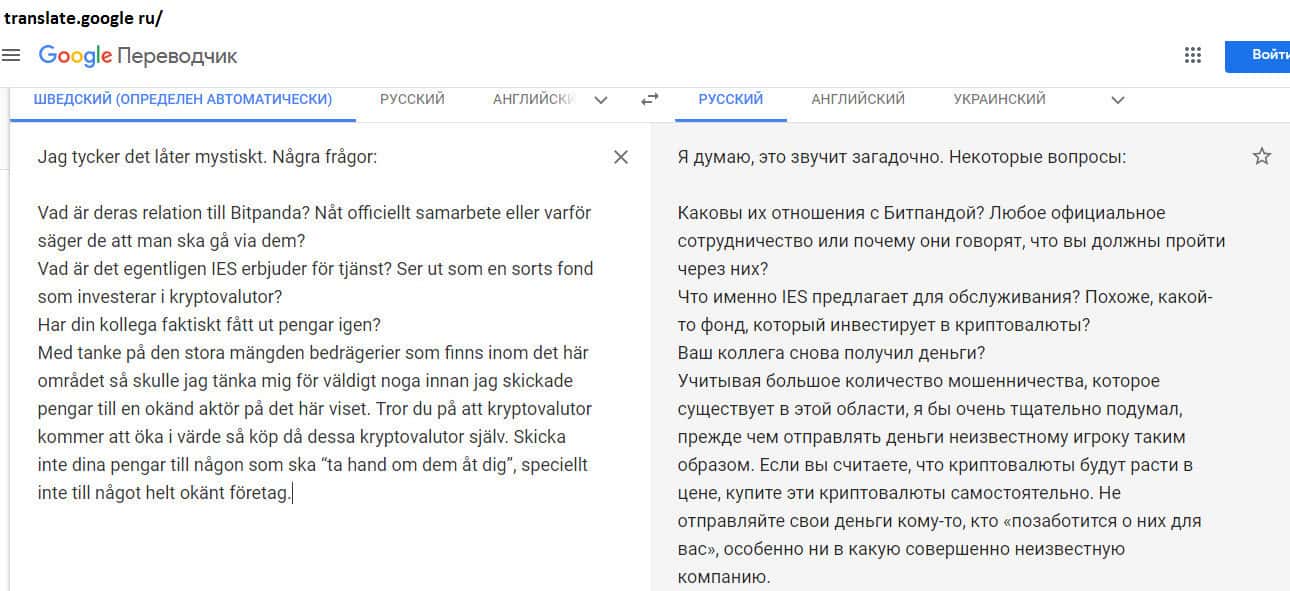 Отзыв о жуликах ИЕС переведен на сайте translate.google ru