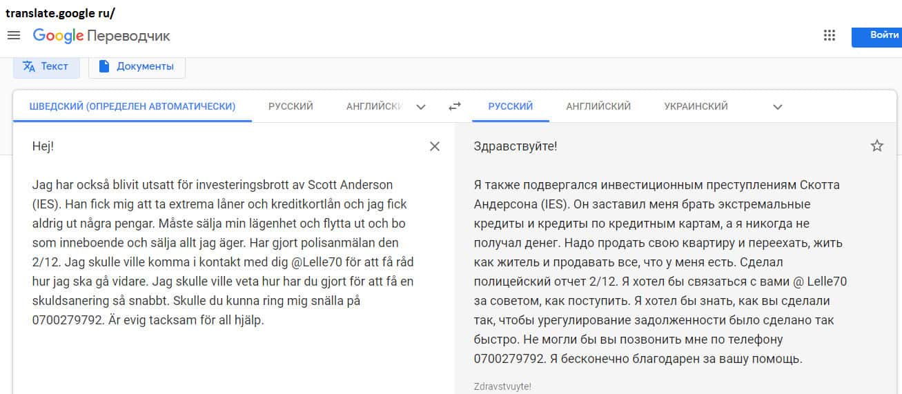 Перевод отзыва о мошенниках ИЕС на сайте translate.google ru