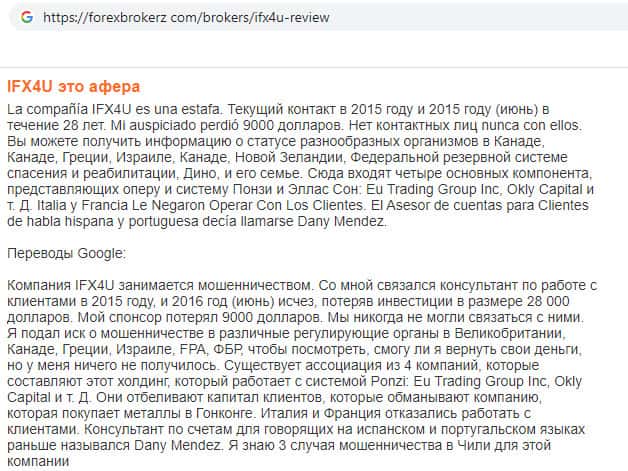Данный отзыв о разводилах ИФХ 4 Ю написал зарубежный пользователь, который рассказал, что вся компания это сплошная афёра. Он потерял там 28000 долларов, а его спонсор потерял 9000 долларов. После чего они обратились в различные суды с иском на компанию, но увы, это не увенчалось успехом, деньги так и не удалось отобрать у аферистов.