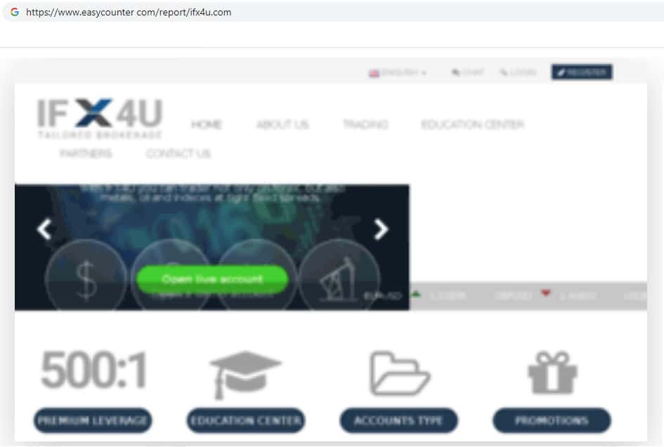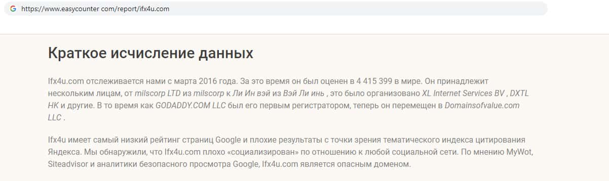 Так же на сайте easycounter com осталась информация о псевдоброкере IFX4U. В ней говорится о том, что сайт компании проверили и оказалось, что компания имела очень низкий рейтинг страниц Googl, что означает низкую популярность компания, так же стало известно что фирма была плохо социализирована по отношению к социальным сетям.