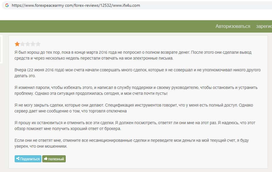 Нам удалось отыскать интернет ресурс, на котором сохранился обзор компании разводил IFX4U. Даже во время работы фирмы у неё уже была плохая репутация. Данный сайт говорит о том, что у жуликов не было регулятора и никакой лицензии, и некоторые пункты главного сайта имели противоречивый характер. Это и заставило сайт сделать вывод о том, что компания является мошеннической.