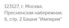 123127, г. Москва, Пресненская набережная, 6, стр. 2 Башня “Империя”