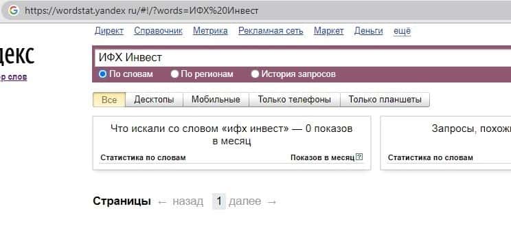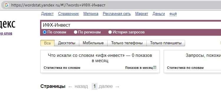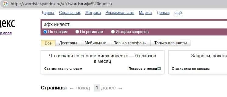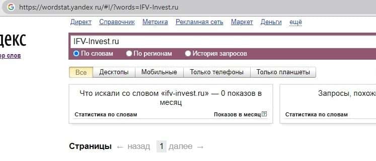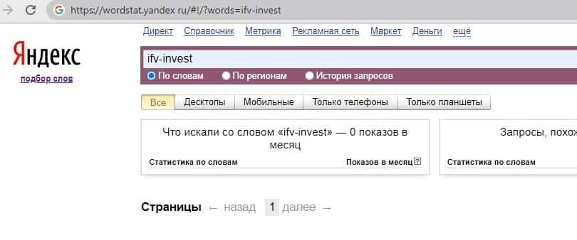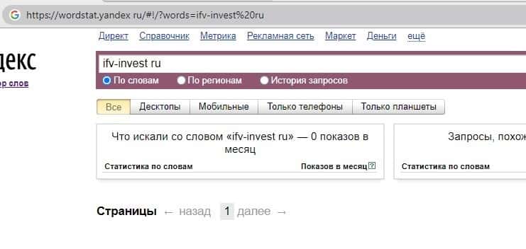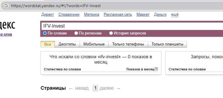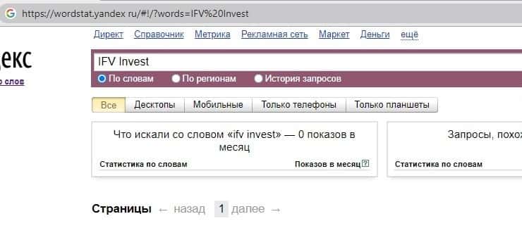 Если вы введёте оригинальное название мошенников "IFV-Invest ru", то в списке по статистики поисковых запросов, вы ничего не найдёте.