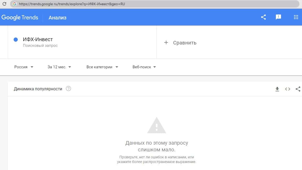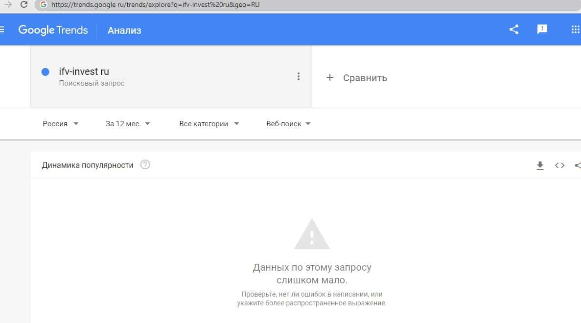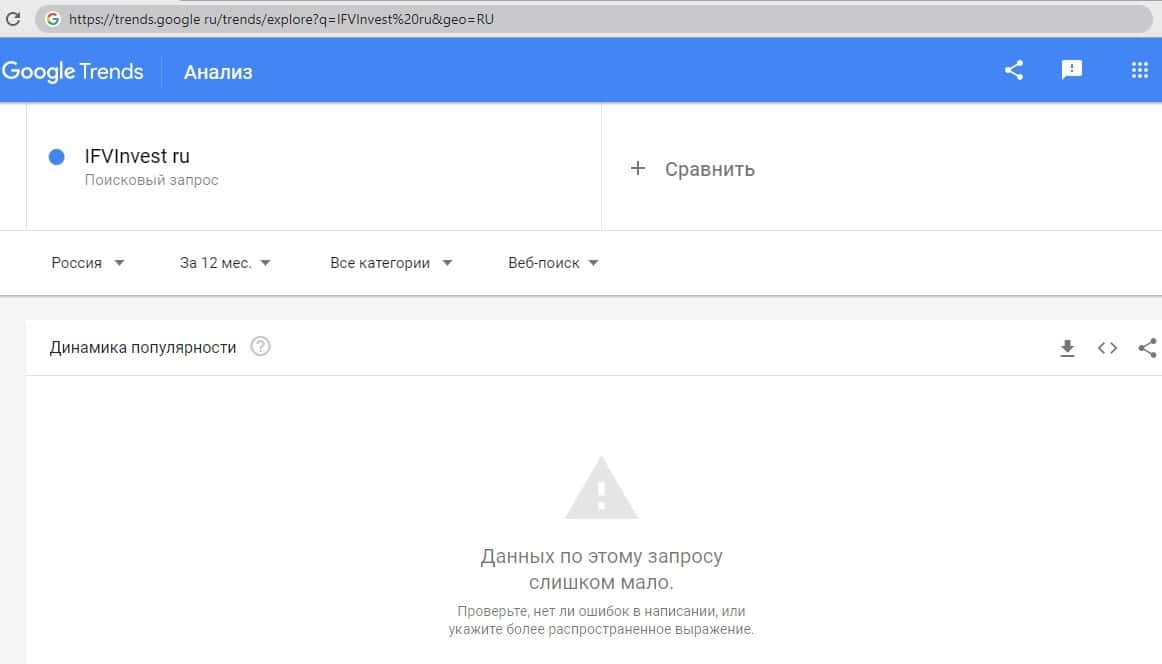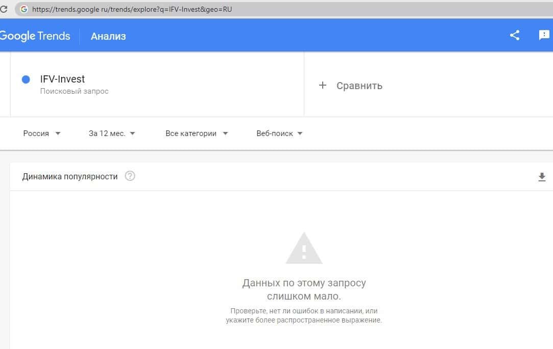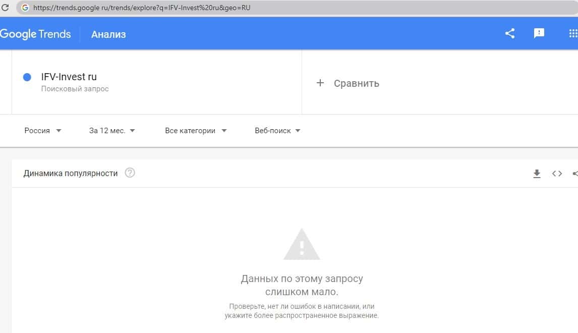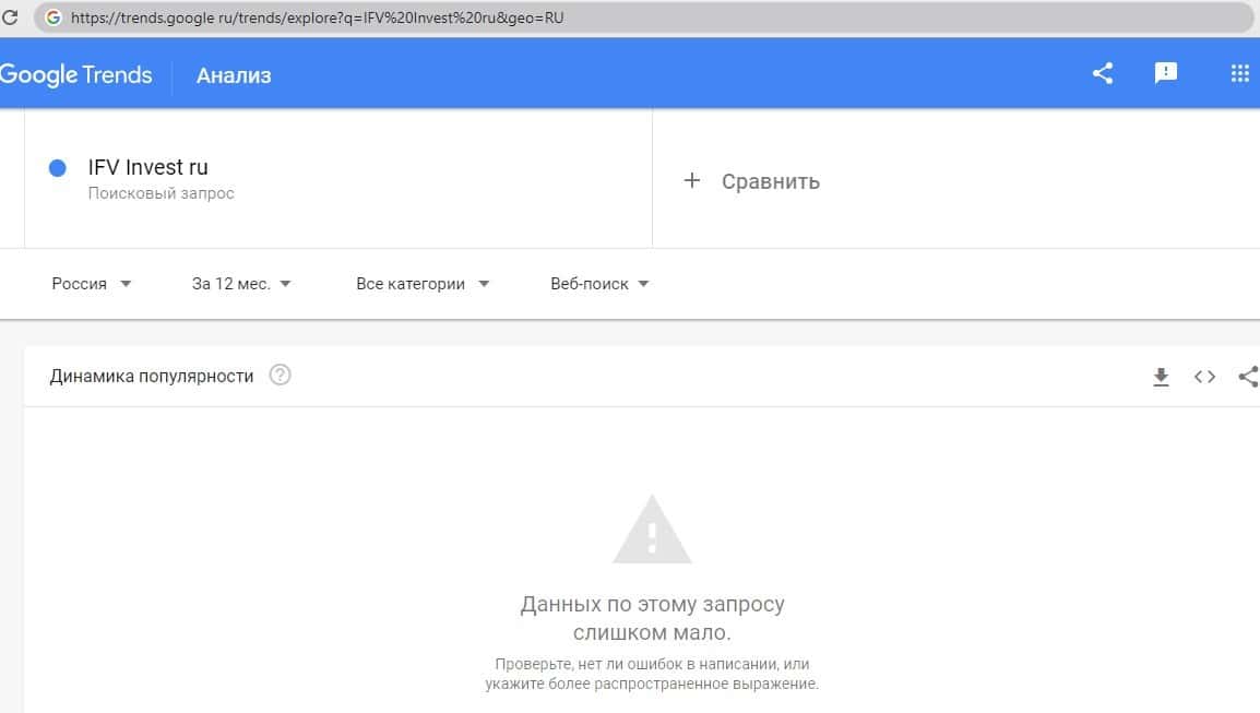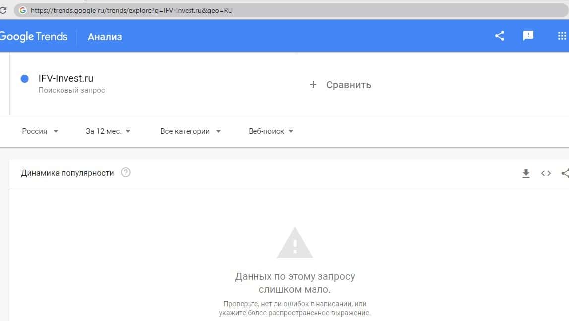 Если ввести запрос по мошеннической организации "ifv-invest ru" по трендам в trends google ru. То всё, что вы найдете, это сплошная пустая страница.