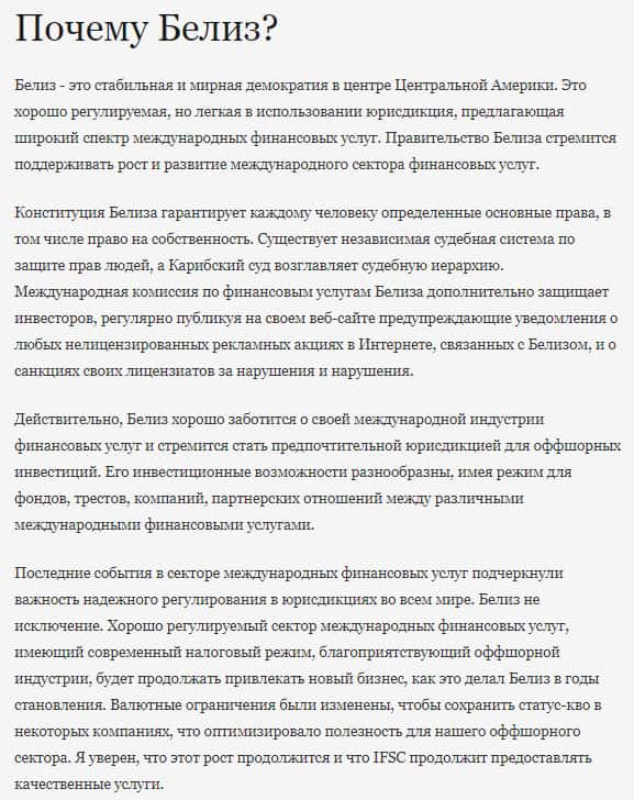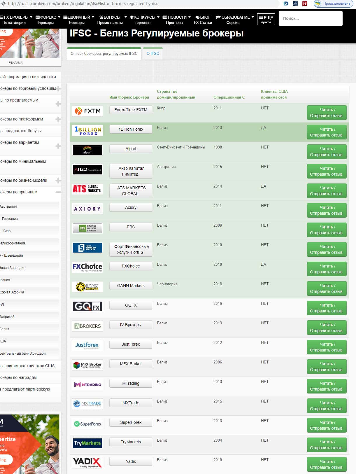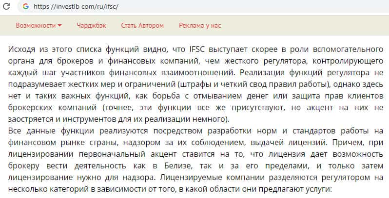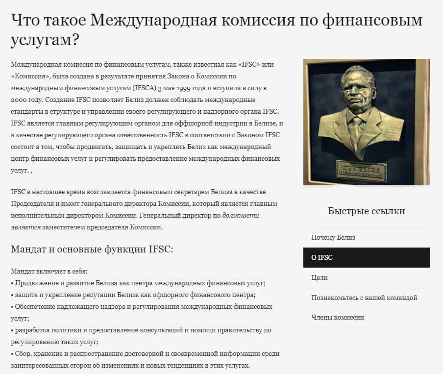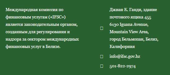 Заканчивается же портал IFSC разделом о Белизе, который обладает хорошо регулируемой, но легкой в использовании юрисдикцией, предлагающей широкий спектр международных финансовых услуг. По факту же, этот мнимый регулятор якобы предоставляет юрисдикцию брокерам, которые подвластны офшорным законам, но происходит все вне рамок закона.