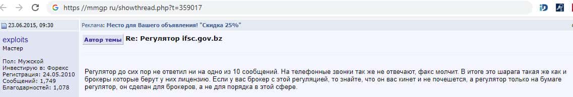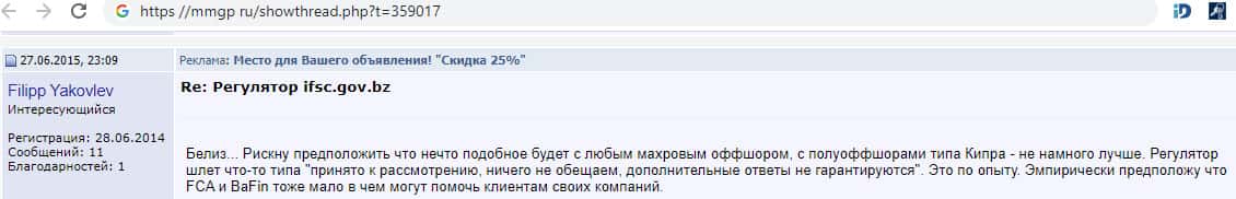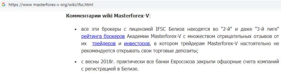 Согласно данным с уважаемого веб-сервиса masterforex-v org, все форекс брокеры с лицензией IFSC Белиза находятся во "2-й" и даже "3-й лиге" рейтинга брокеров Академии Masterforex-V с множеством отрицательных отзывов от их вкладчиков. Поэтому, сотрудники сайта настоятельно не рекомендуют связываться с фиктивным регулятором IFSC.