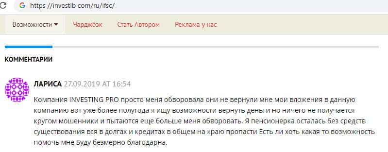 Женщина поделилась своим возмущением по поводу того, что надувательский форекс брокер INVESTING PRO внаглую заманил ее в ловушку и обворовал. Несмотря на многочисленные жалобы клиентки в данную шарагу, деньги ей так никто и не вернул. А данный псевдоброкер находится под регулированием такой же форекс кухни IFSC.