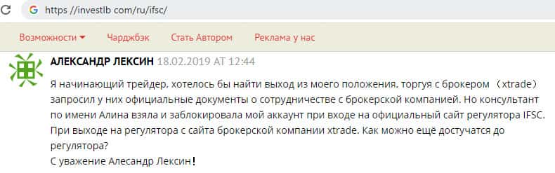 На нижеуказанном изображении начинающий трейдер поделился своей историей по поводу того, что при обращении к своему брокеру xtrade о предоставлении официальных документов. Но консультант моментально заблокировал аккаунт мужчины, как только он попытался связаться с регулятором IFSC. Явно, что липовый регулятор заодно с нечестным брокером.