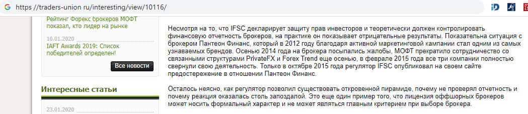 По мнению веб-портала fxtraders info работа с регулятором IFSC не предоставляет никаких гарантий