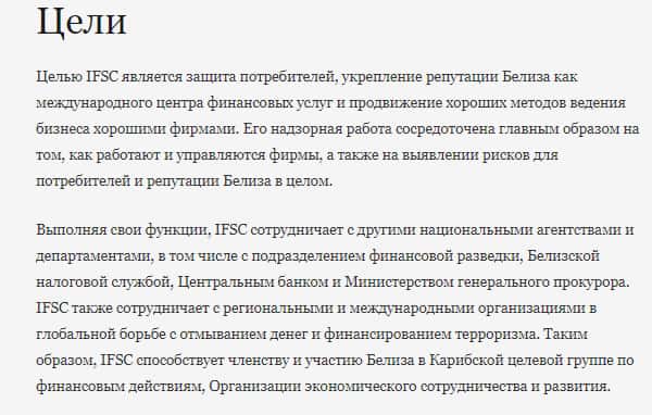 На следующей странице ресурса IFSC, который посвящен описанию целей данной шарашкиной конторы, все также оформлено весьма радужно и красочно. Целью псевдорегулятора является якобы защита потребителей, выявление рисков для вкладчиков и репутации Белиза в целом. На самом деле, они работают только во благо мошенников.