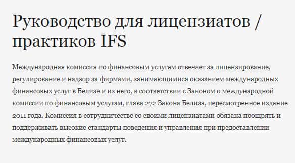 Затем на веб-сервисе у лохотронской организации IFSC идет речь о руководстве для лицензиатов / практиков IFS, в котором говорится о том, что лживая контора отвечает за лицензирование, регулирование и надзор за фирмами, занимающимися оказанием международных финансовых услуг в Белизе. В общем, развод на лицо.