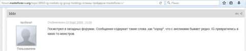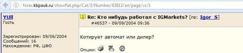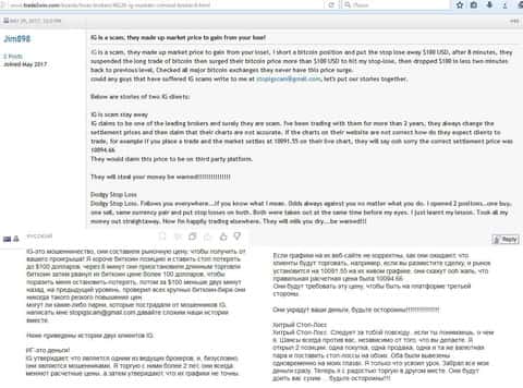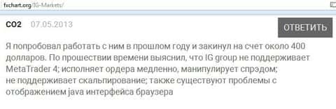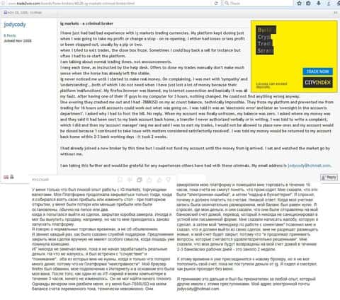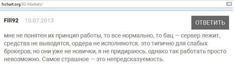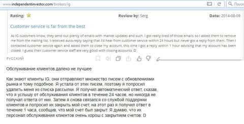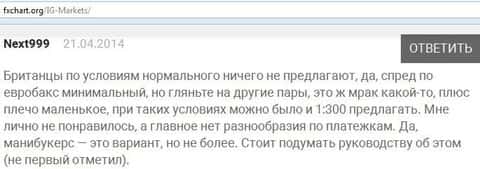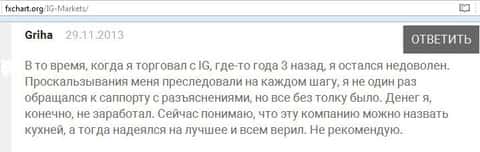 Клиенты кухонного брокера пишут, что им не понравилось работать с ig так как служба поддержки у них очень слабая и даже в письмах имеет наглость не отвечать. Информацию приходится искать в сети Internet на форумах. Впечатление от компании, как понимаете, осталось крайне негативное у автора .
