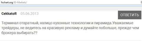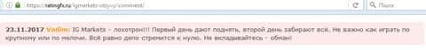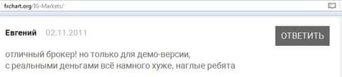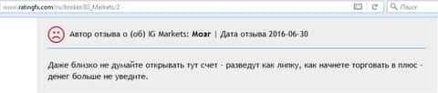Процесс трейдинга всегда сопровождается негативными явлениями с абсолютно любой кухней Forex. Детальный поиск имеющейся в глобальной сети информации о брокерской компании ИГ Маркетс, позволяет сделать вывод о том, что процесс торговли у них не имеет ничего общего с реальными торгами на межбанке. Дилинговый центр IG Markets Ltd является одной из опасных мошеннических контор, которые обворовывают простых пользователей мировой паутины, так сказать, любителей быстро подзаработать на Форексом. Понятие мошенничество в подобных "Кухнях" обрело обычный, не противоправный характер. Уверенные в своей безнаказанности они продолжают обворовывать доверчивых людей.