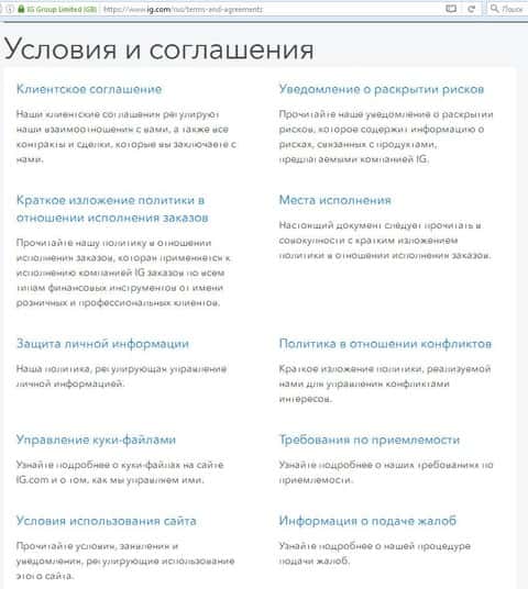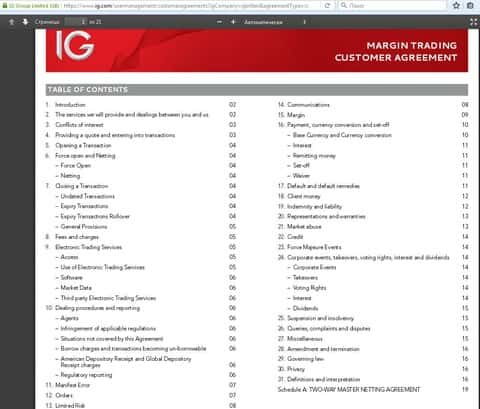 Основным юридическим документом, закрепляющим отношение между компанией и брокером IG Markets Ltd, как и у любого другого дилингового центра, является клиентское соглашение. Содержание, которое расскрывает стандартные нормы и условия, присущие всем кухням внебиржевого рынка, где играют по мошенническим правилам направленным на обворовывание простых пользователей сети Интернет. Клиентское соглашение с forex-лохотроном выложен в публичный доступ на официальном сайте ей конторы ig com с.