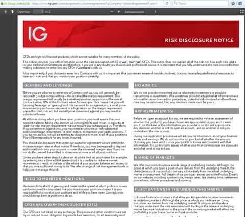 Ниже можно ознакомится с этим нормативно-правовым актом от мошеннической организации IG Markets Ltd. Данный нормативно-правовой акт также невозможно детально изучить русскоговорящему человеку, без хорошего знания английского языка. По этой причине увидеть различного рода подводные камни этого интернет-лохотрона, обворовывающего представителей интернет-сообщества, которые проживают на территории разных государств бывшего совка достаточно проблематично.