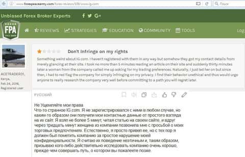 Очень интересная история произошла с другим трейдером, которого без регистрации в IG Markets Ltd, стали доставать звонками их сотрудники. Все это произошло после банального посещения их сайта. Каким образом они узнали личные данные человека не известно, остается только догадываться...