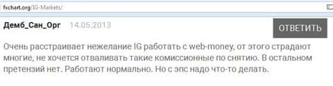 Кроме этого очень мало вариантов для вывода денег клиентов, что тоже вносит неудобство в процесс работы трейдерам. Клиенты сетуют, что IG Markets не желает работать с web-money, им приходится тратиться на большие банковские комиссии.