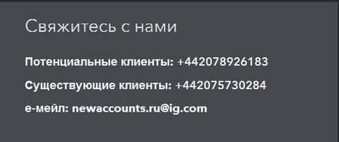 Клиентская поддержка должна быть в абсолютно любом дилинговом центре для предоставления помощи всем трейдерам, работающим с ними. Поэтому она есть и в компании IG Marketrs Ltd. Но как Вы уже наверное догадались, в этой брокерской "Кухне" все организовано абсолютно противоположным образом. При возникновении каких-либо проблем у клиентов, они службой поддержки не только не решаются, но и еще усугубляются. Основное, что делает клиентская служба поддержки - занимается лишь отписками на жалобы жертвам мошенничества. На что еще следует обратить внимание? Это варианты для связи клиентов с представителями брокера. Связаться можно по почте или телефону, причем телефон не бесплатный. Клиенты, позвонившие в поддержку, будут оплачивать звонок по тарифу международного роуминга.