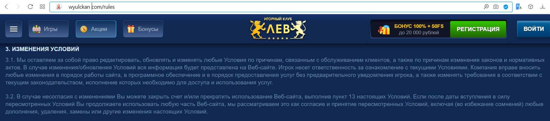 В разделе 3 об изменении условий договора казино Wyulckan пишет, что администрация может изменять правила по своему усмотрению без уведомления игрока.