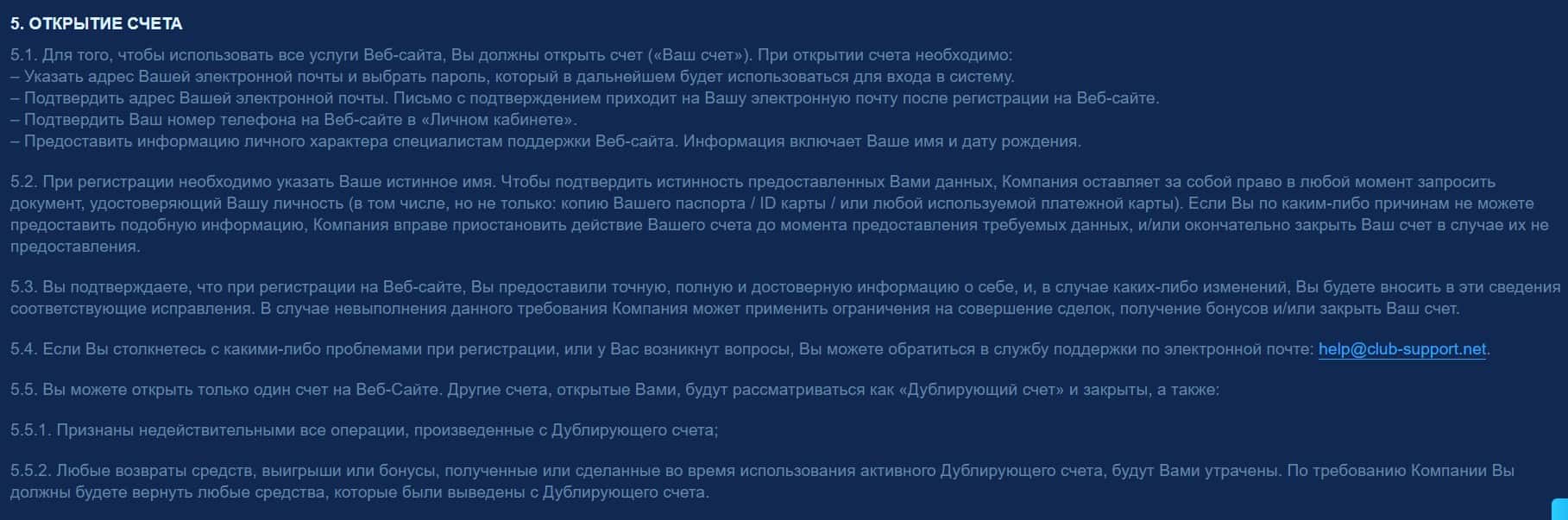 В пункте 5 договора компании Игорный клуб Лев рассматриваются правила открытия счета, а также условия, при которых счет игрока может быть заблокирован, а средства утрачены.