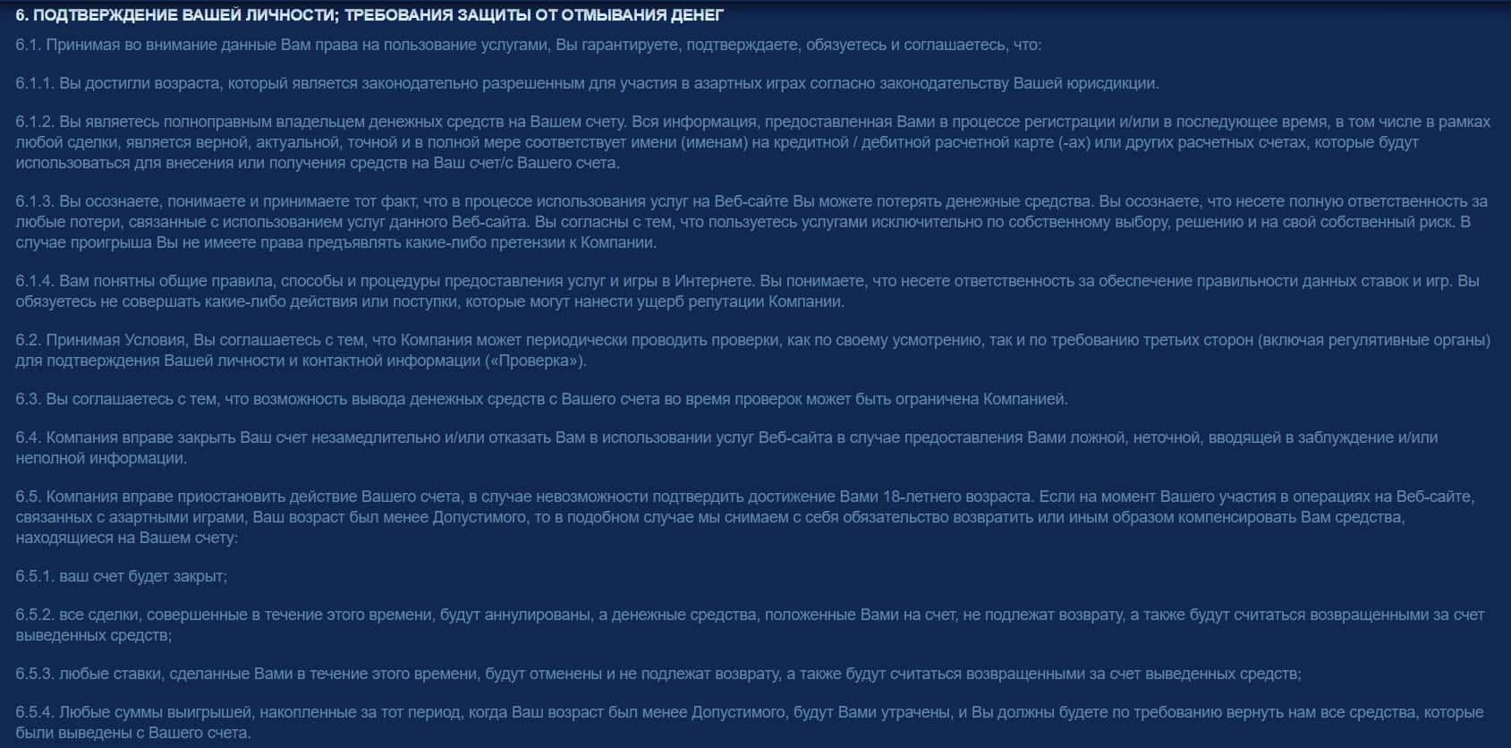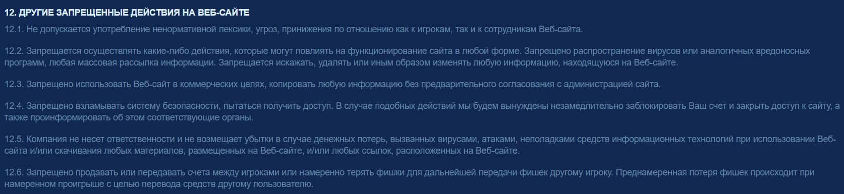 Пункт 6 является очень важным для пользователя, так как руководствуясь этим разделом администрация может заблокировать учетную запись игрока и лишить его средств.
