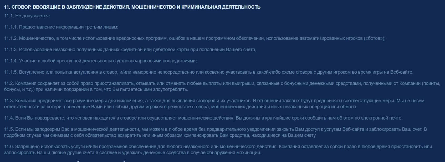 Пунктом 11 также очень любит пользоваться в своих целях администрация сайта Игорный клуб Лев. Игроков часто банят в соответствии с положением о мошенничестве и сговоре.