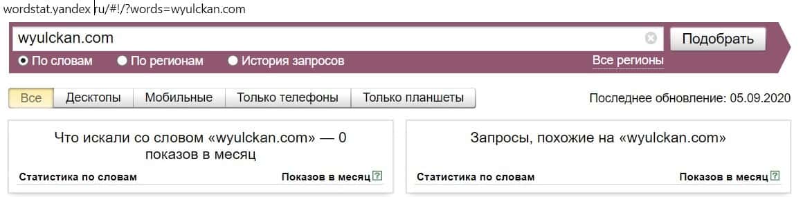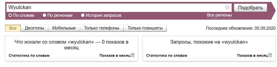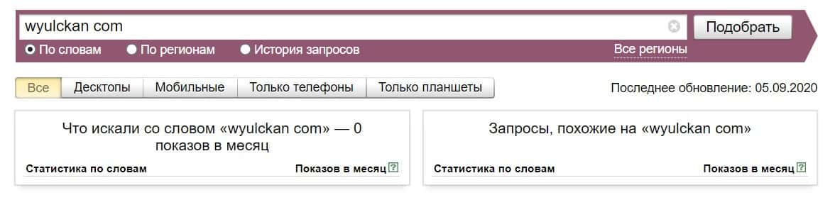Количество запросов по доменному имени "wyulckan com", написанного с пробелом, по данным сервиса Яндекс Вордстат, равно такой же цифре - 0 показов.