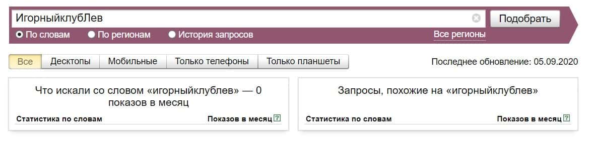 Название бренда "ИгорныйклубЛев" на русском языке без пробела пользователи не искали в системе Яндекс, результат равен 0.