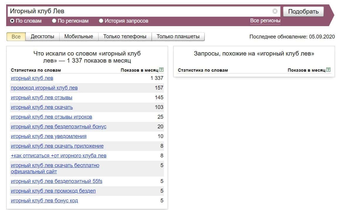 Название бренда "Игорный клуб Лев" на русском языке люди искали в системе Яндекс намного чаще, результат равен 1337 показам.