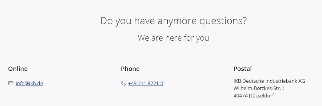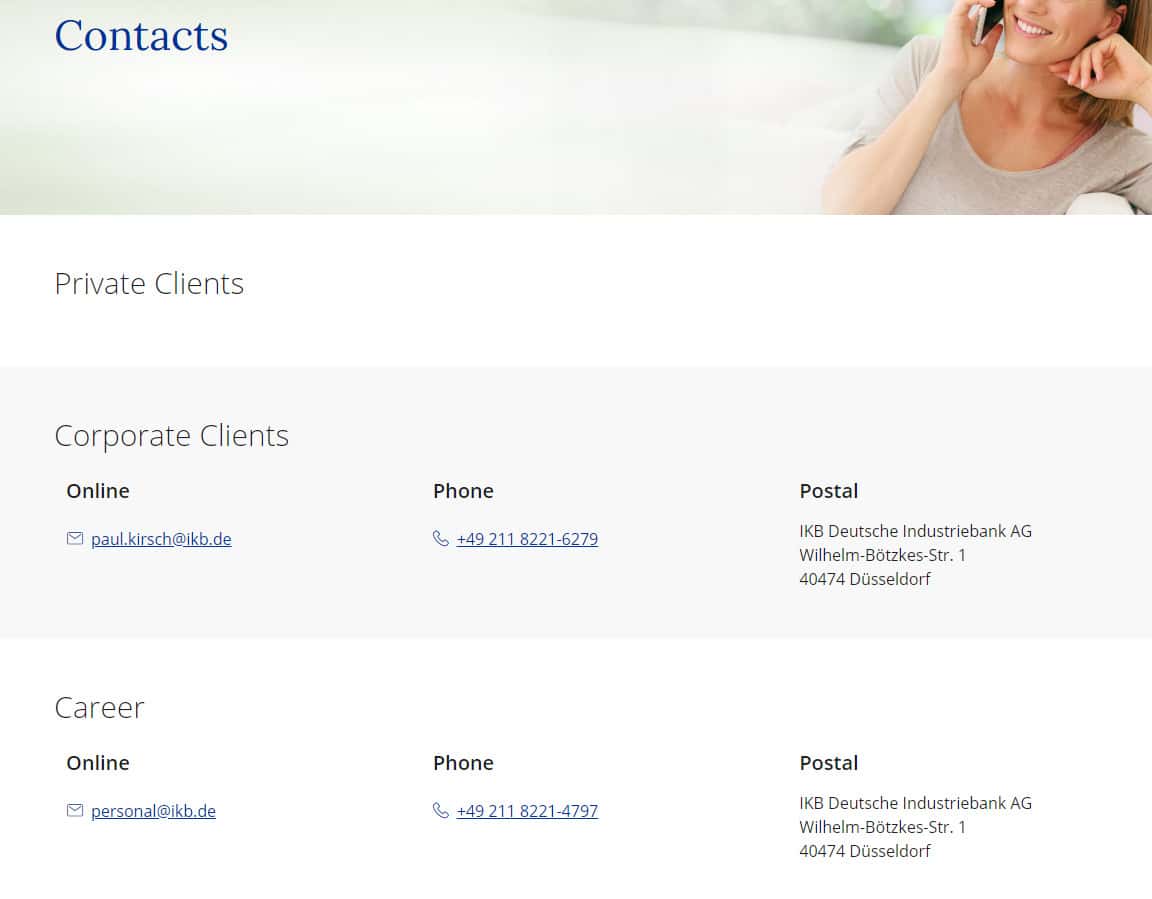 Под свои контакты аферисты IKB Deutsche Industriebank AG отвели отдельный раздел сайта, где указали довольно малое количество контактов, что не особо сходится со всеми обещаниями мошенников IKB на их подвальном сайте на просторах сети интернет. Итак ниже перечислим указанные аферистами ИКБ контакты для связи с ними: