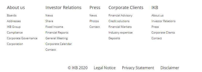 Завершается же подвальный сайт у аферистов IKB Deutsche Industriebank AG довольно стандартно и ожидаемо, а именно ссылками на различные разделы их подвального сайта, что довольно таки банально и типично, а так же говорит о не особом желании проходимцев ИКБ заниматься своим сайтом, что вы можете увидеть на изображении ниже.
