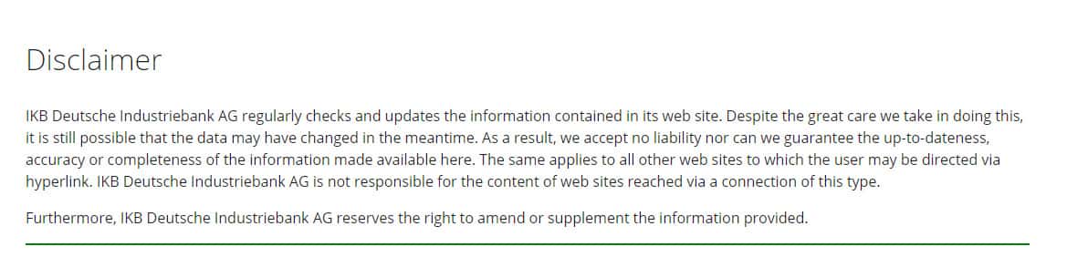 Несмотря на многочисленную лапшу на уши в исполнении мошенников IKB, а так же других весьма сомнительных доводов жуликов IKB Deutsche Industriebank AG они ничего толком и не говорят о своих условиях сотрудничества. Вместо этого у шулеров ИКБ имеется отказ от ответственности за свою деятельность и содержимое своего подвального сайта.