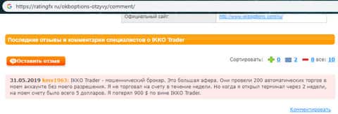 Отзыв облапошенного IKKO Trader пользователя с портала ratingfx ru