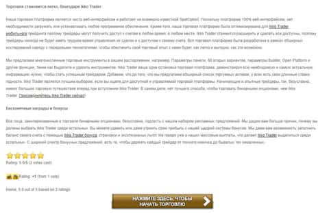 Начинается сайт у аферистов IKKO Trader с довольно устаревшей, в плане дизайна, шапки сайта, которая тем не менее уже забита различными торговыми обещаниями мошенников ИККО Трейдер об безубыточных торгах и высоком профите. На изображении, расположенном ниже, вы можете увидеть шапку сайта шулеров IKKO Trader.
