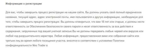 Условия сотрудничества у лохотрона ИККО Трейдер начинаются с условия о том, что клиент соглашается на их принятие фактом регистрации в данной мошеннической помойке. На изображении, расположенном ниже, вы можете увидеть начало клиентского соглашения аферистов IKKO Trader.