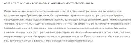 После лохотрон IKKO Trader так вообще отказывается от любых гарантий, связанных с сайтом или же торговой платформой, указывая что клиенты сами должны понимать, что идут на риск торгуя у мошенников ИККО Трейдер. На изображении, расположенном ниже, вы можете увидеть конец условий аферистов IKKO Trader.