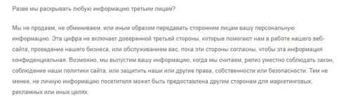 Далее практически вся политика конфиденциальности у аферистов ИККО Трейдер состоит из воды вплоть до момента, когда мошенники IKKO Trader обещают не раскрывать личную и персональную информацию клиентов, хотя оставляют право на ее раскрытие партнерам, о чем вы можете прочесть на изображении, расположенном ниже.