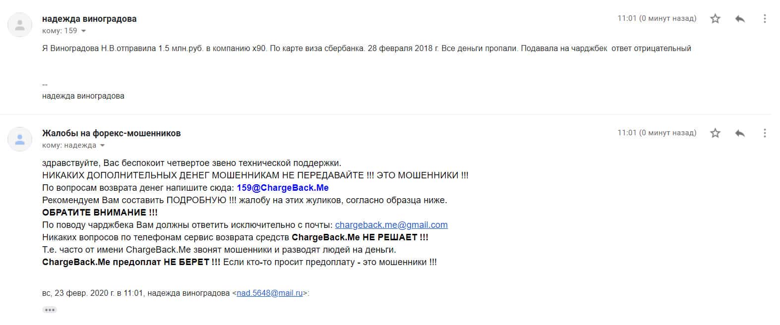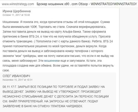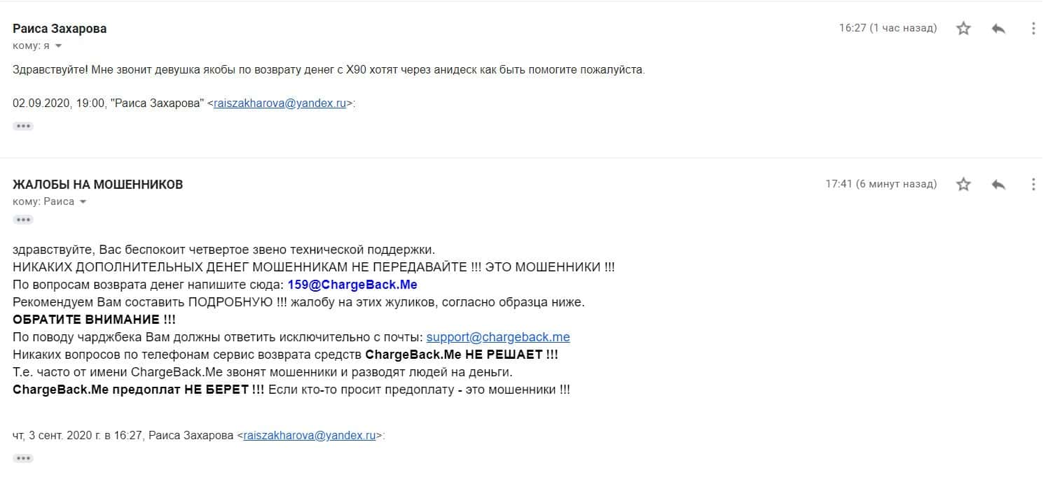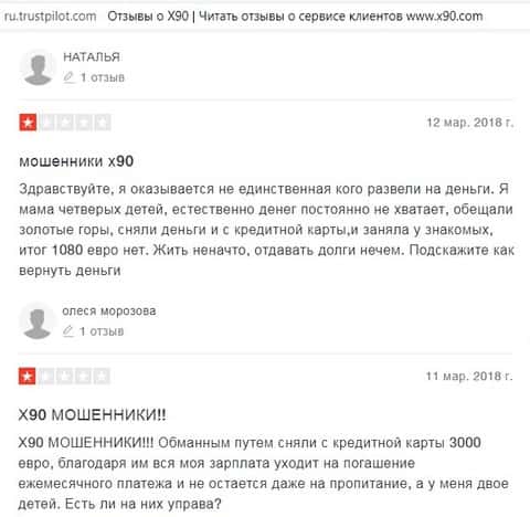 У некоторых получается воспользоваться чарджбэком или связаться с банком, чтобы аннулировать транзакцию по перебросу денег на счёт жуликов X90. Но в любом случае, десятки и сотни людей остаются без честно заработанных денег, так как платформа Икс 90 создана не для заработка своих клиентов, но для заработка на них самими владельцами-мошенниками.