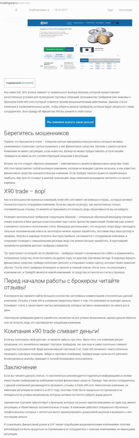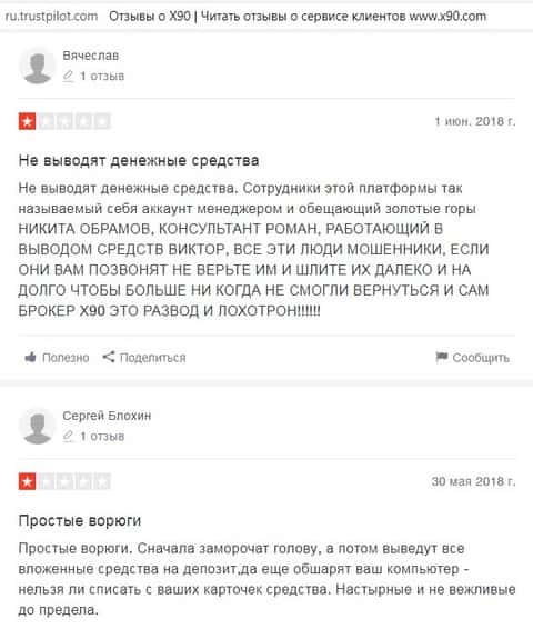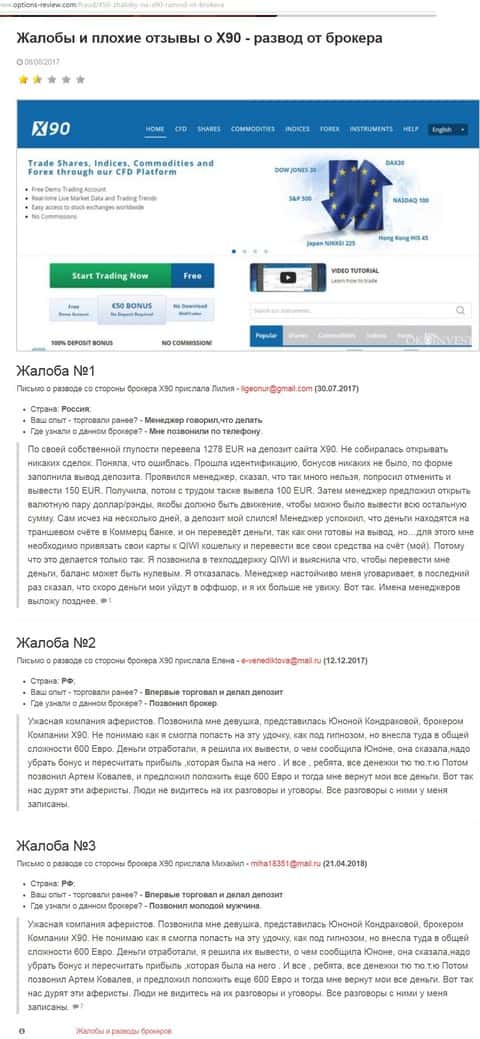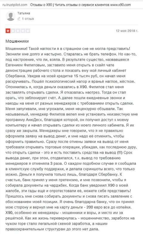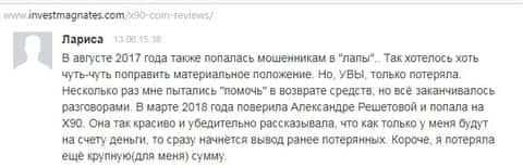 Имеющийся в сети Интернет материал о X90 подтверждает принадлежность данного брокера к мошенническим конторам, где кроме как кидалова ничего своим клиентам не организуют.