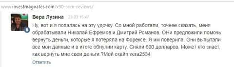 Многие мошенники действуют сообща, чтобы запутывать клиентов, и отщипывать каждый понемногу денег. Таким образом поступает и лохотрон Икс 90, который вместе с другим брокеров-мошенником развели клиента на деньги, которые ему будет очень сложно вернуть.