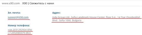Как не сложно было догадаться, реальных данных о контактах либо руководстве конторы Икс 90 попросту нет, только фейковый адрес, мэйл и пару телефонов – стандартный набор всех мошенников, которые озабоченны не качественным сервисом, а выманиванием денег у доверчивых клиентов.