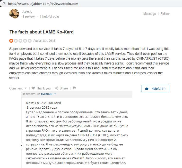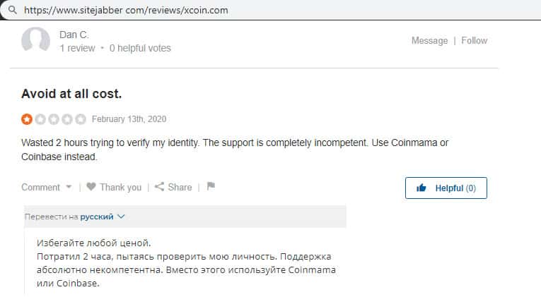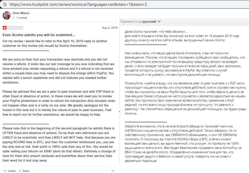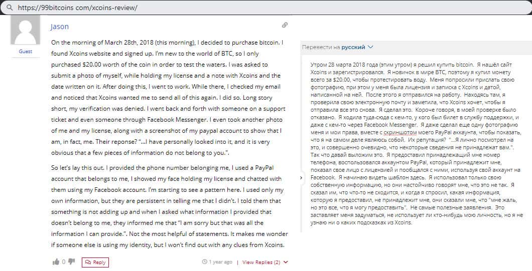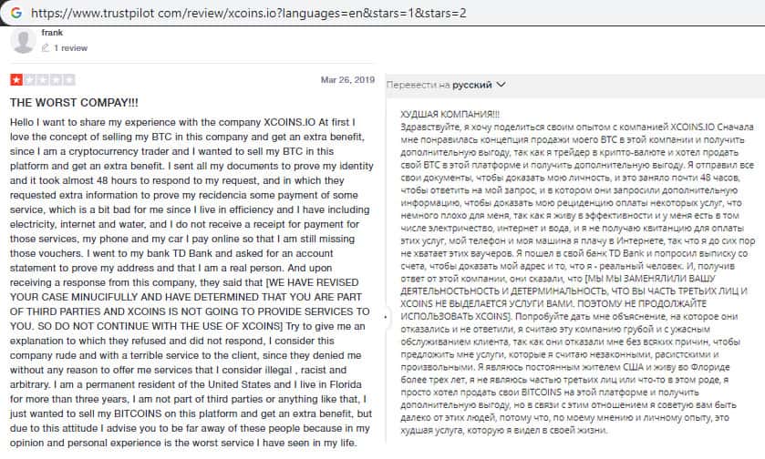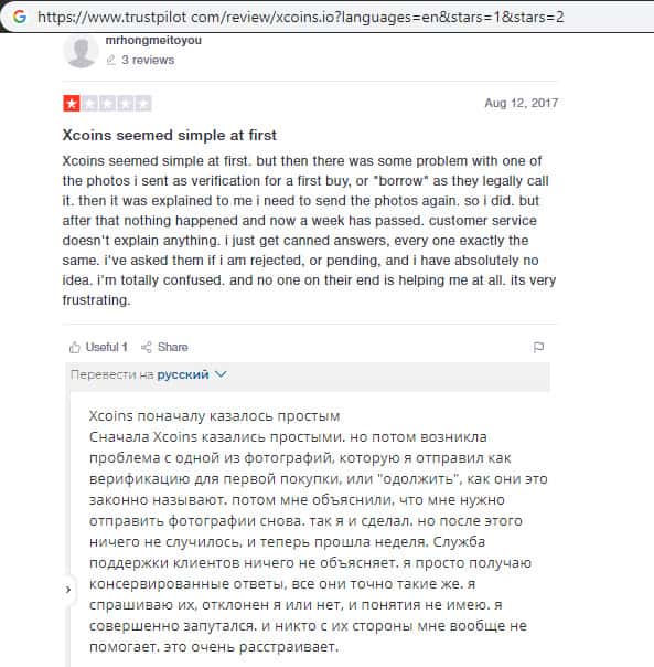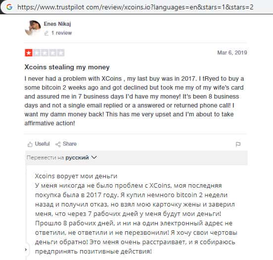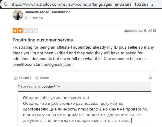 Автор данного отзыва остался настолько недоволен сервисом, предоставляемый шулерами Икс Коинс, что написал отзыв аж на двух языках. В целом он столкнулся с той же проблемой, что и другие клиенты: после совершения платежа жульё отказывает в верификации аккаунта без видимой на то причины, ссылаясь на факторы, не связанные с действительностью.